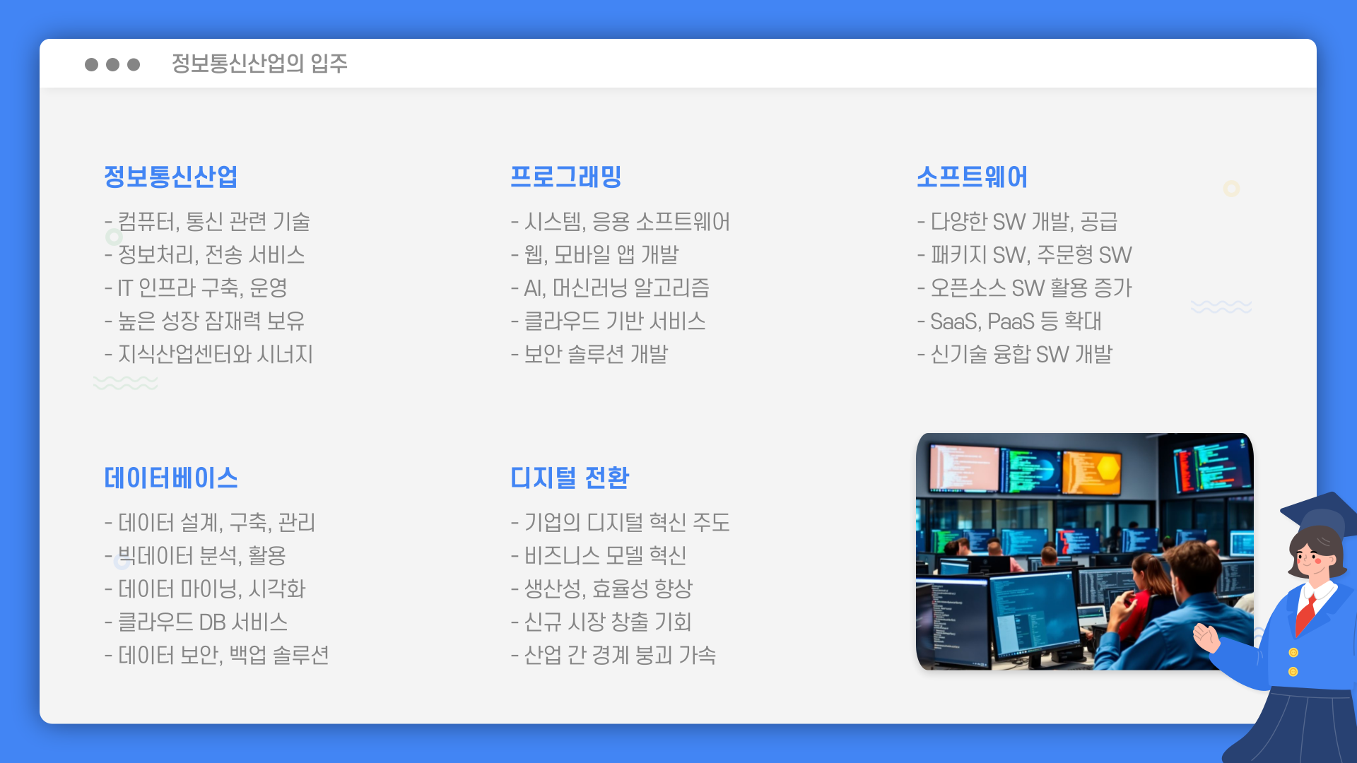 정보통신산업도 빼놓을 수 없어요! 컴퓨터 프로그래밍, 소프트웨어 개발, 데이터베이스 관리 등 다양한 분야가 포함됩니다. 요즘은 디지털 전환이 가속화되면서 이 업종이 더욱 중요해지고 있죠.