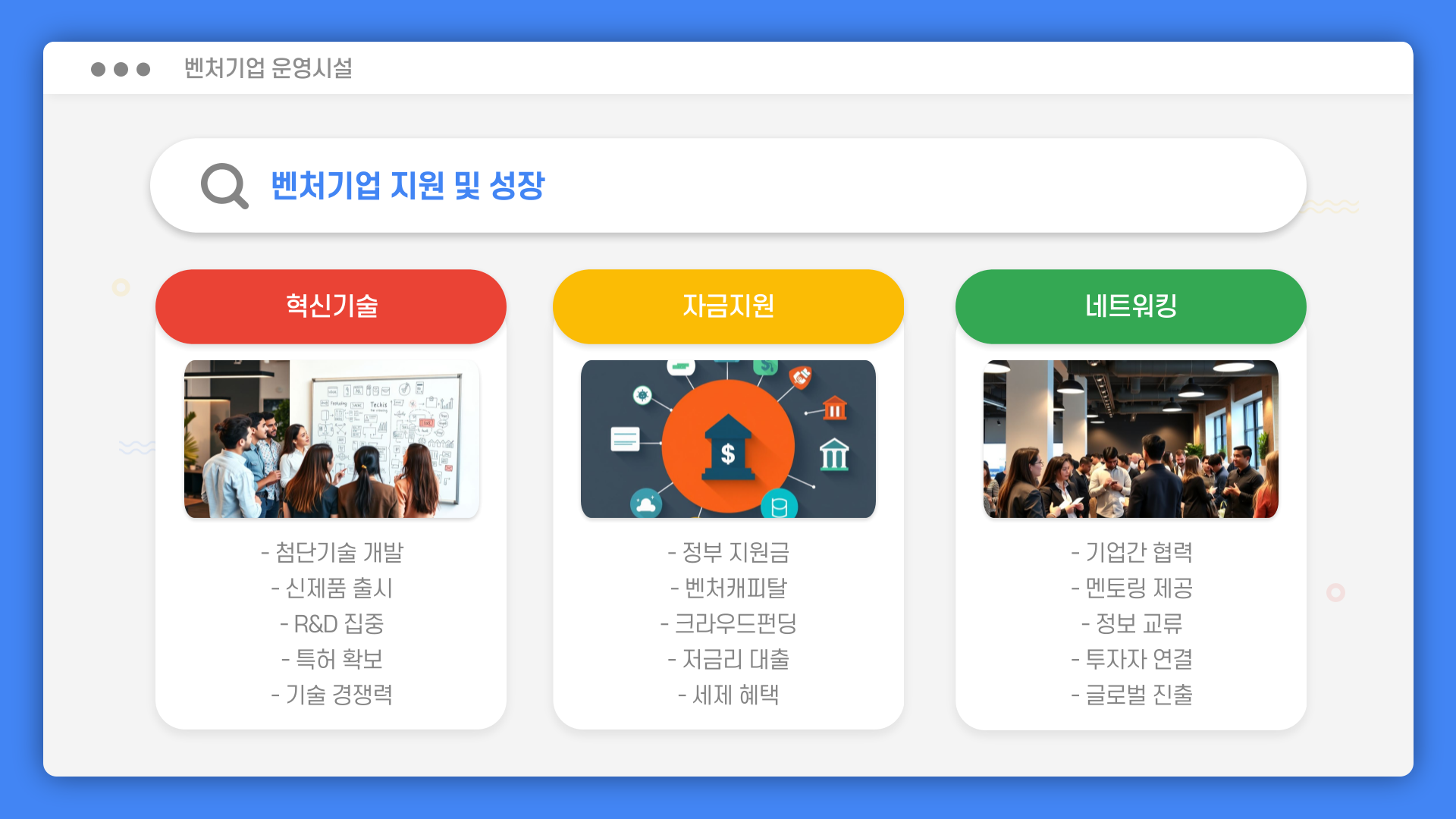 이제 벤처기업에 대해 이야기해볼까요? 벤처기업은 혁신적인 아이디어와 기술을 바탕으로 새로운 시장을 창출하는 기업이에요. 이들은 반드시 필요한 시설과 서비스를 갖춘 공간이 필요하죠.