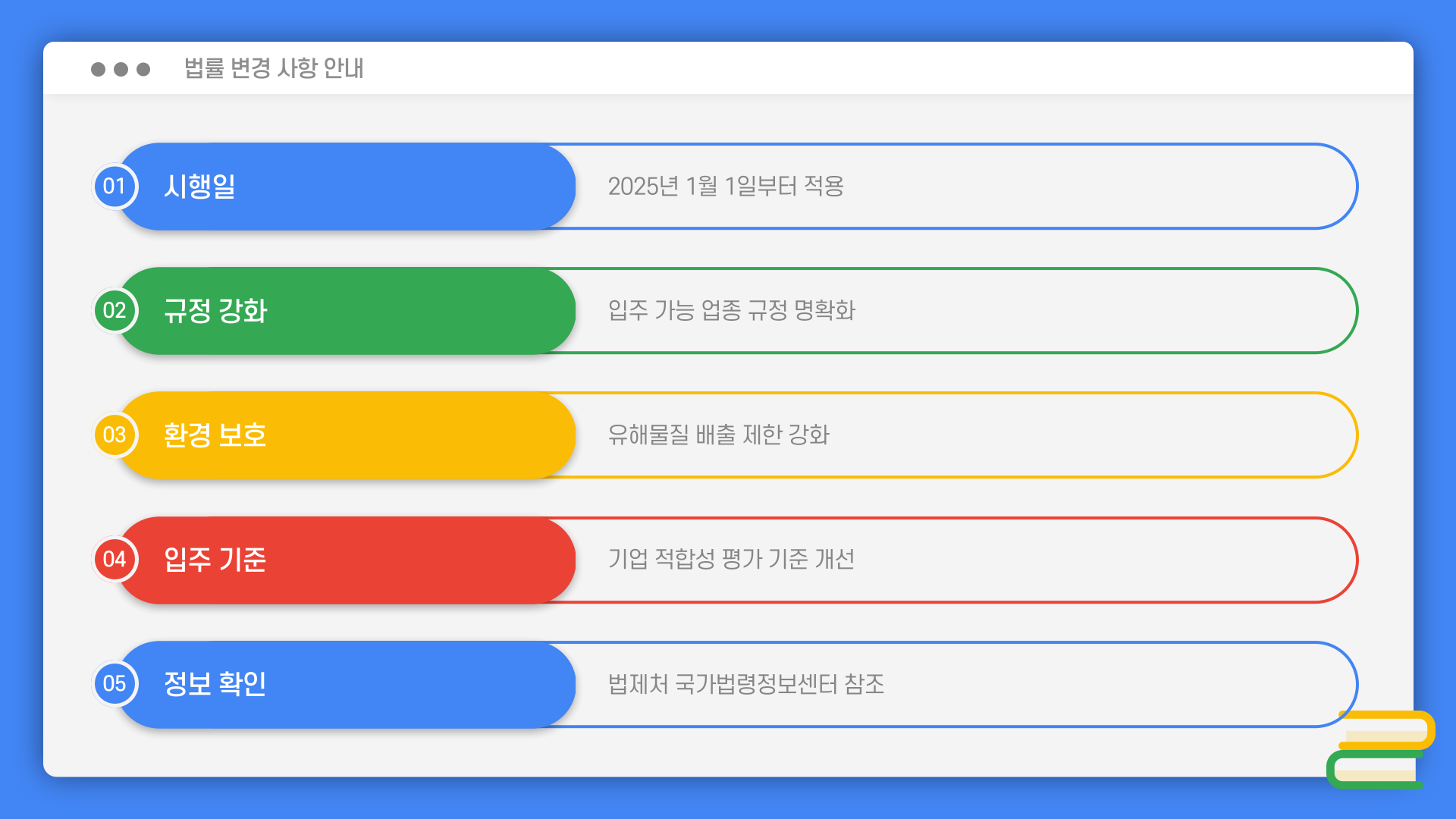 2025년 1월 1일부터는 산업집적법 개정으로 입주 가능 업종에 대한 규정이 강화되었어요. 이 법률은 기업의 입주 기준을 더욱 명확히 하고, 환경 유해 물질을 배출하지 않는 업종의 입주를 촉진하기 위해 개정된 것이랍니다.