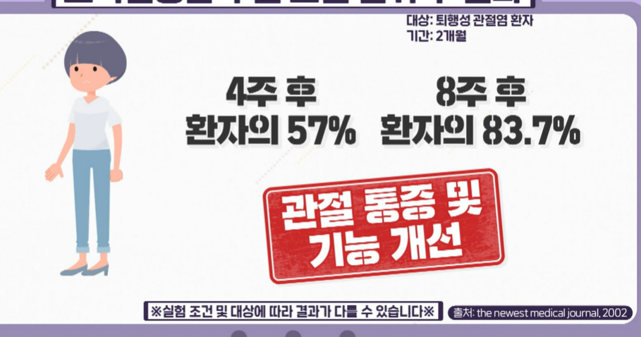 실제로 국내 대학병원에서 퇴행성 관절염 환자들을 대상으로 초록입홍합 오일을 두 달 동안 섭취하게 한 결과 4주 후에는 환자의 57%, 8주 후에는 환자의 83.7%에서 관절 통증과 기능이 개선되었다고 합니다. 또한 전문 의료인 소견에서는 환자의 90%에서 골관절염 증상이 개선되었다고 평가하였습니다.