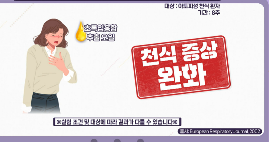 초록입홍합 오일의 강력한 항염증성 능력이 각종 질환 예방에 도움이 된다라고 하는 연구 결과도 있는데 초록입홍합 추출 오일을 아토피성 천식 환자에게 8주간 투여한 결과 대조군에 비해서 천식 증상이 완화된 것으로 나타났다고 합니다.