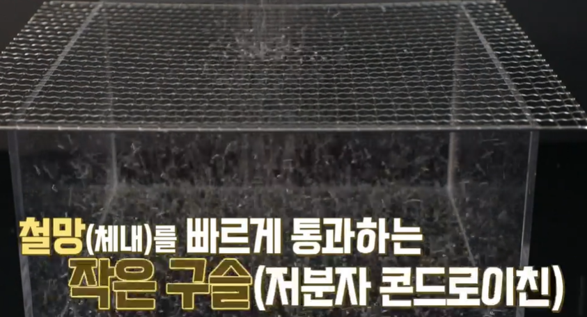 그 결과 크기가 큰 구슬 철망이 통과하지 못한 것처럼, 고분자 콘드로이친은 체내 흡수가 어려운 반면, 저분자 콘드로이친은 체내 흡수율이 높아 관절 건강에 더 도움을 줄 수 있다고 합니다.