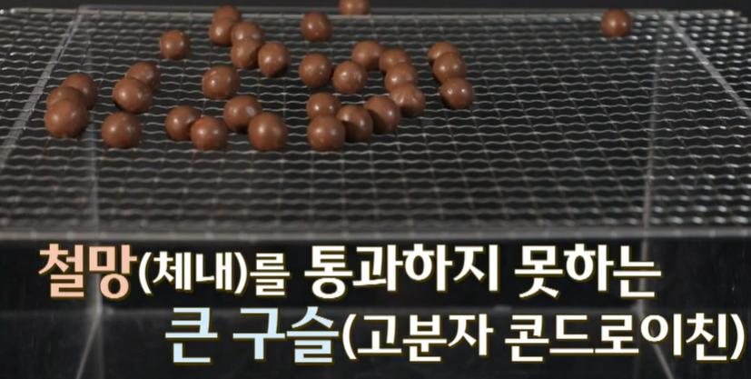 이해를 돕기 위해 큰 구슬을 고분자 콘드로이친, 작은 구슬을 저분자 콘드로이틴으로 가정하고 철망에 떨어뜨려 보았습니다.
