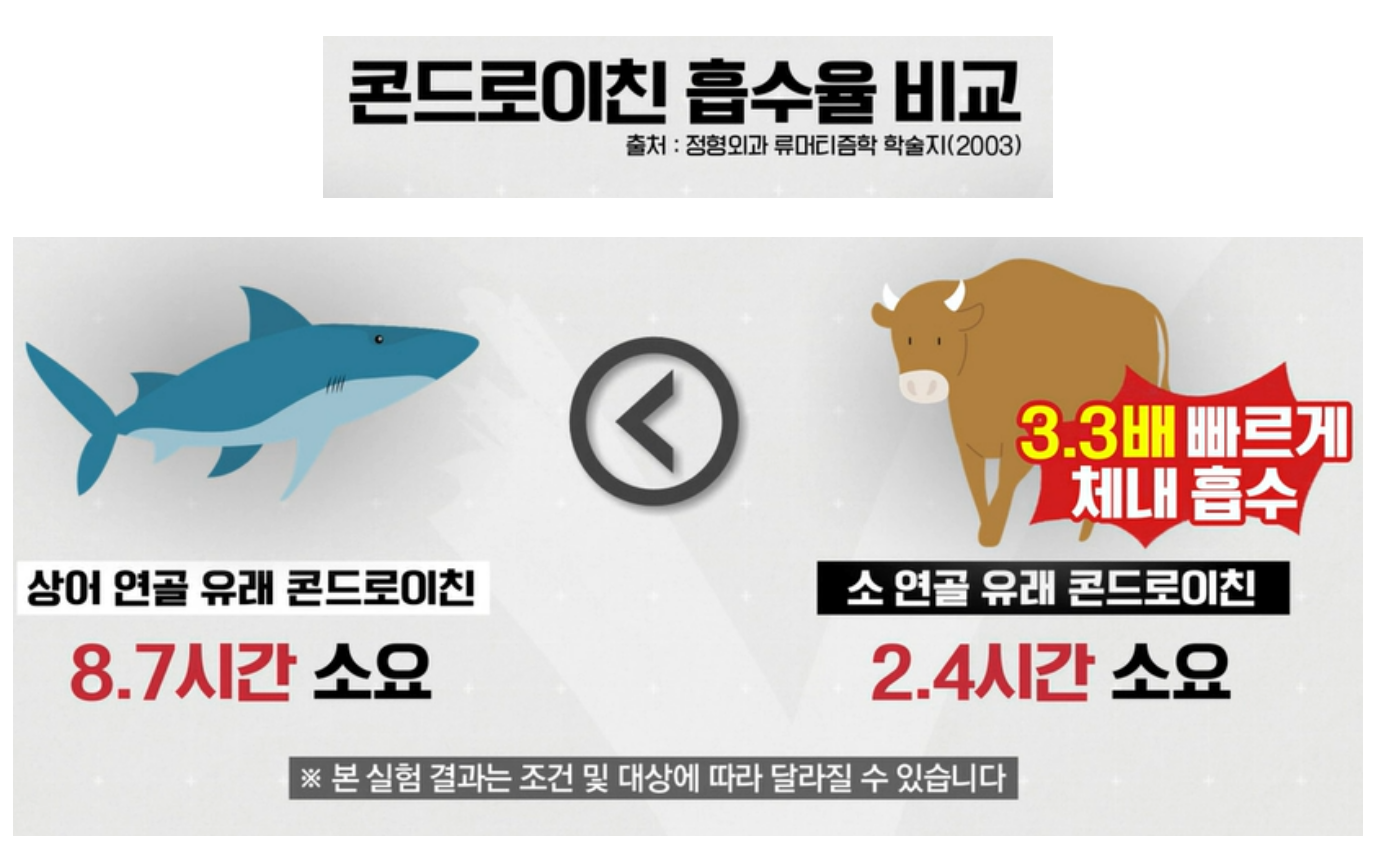 실제로 콘드로이친 흡수율을 비교했을 때 상어 연골 콘드로이친은 약 9시간이 소요되는 반면, 소 연골 콘드로이친은 2.4시간 소요되는 것으로 3.3배 빠르게 체내 흡수되는 것을 확인했습니다.