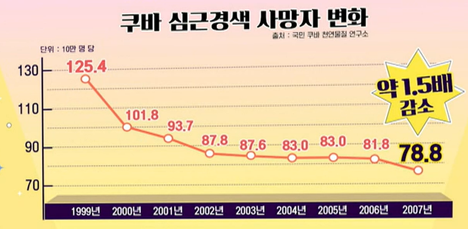 쿠바인의 콜레스테롤 수치 감소로 심근경색 사망자가 1999년 인구 10만 명당 125.4명이었던 것이 약 10년이 안 된 2007년도에는 78.8명으로 감소해 건강 빈민국이 아닌 건강 장수국으로 거듭나게 되었습니다.