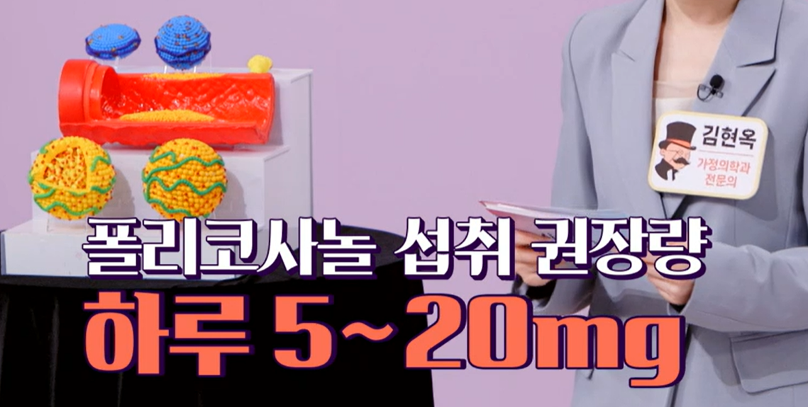 콜레스테롤 때문에 뇌혈관이 막히면 1분에 뇌세포가 약 200만 개가 죽습니다. 그만큼 콜레스테롤 관리는 뇌혈관 건강과 직결되어 있다 해도 과언이 아닙니다. 폴리코사놀은 혈관에 끈적이는 콜레스테롤을 제거하고, 좋은 콜레스테롤 수치인 HDL을 높이는 데 효능이 있는 것으로 알려져 있습니다.