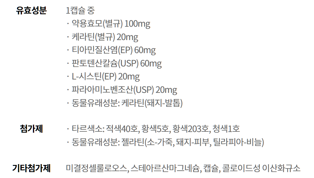 판시딜 1 캡슐 중에는 약용효모 100mg, 케라틴 20mg, 티아민질산염 60mg, 판토텐산칼슘 60mg, L-시스틴 20mg, 파라아미노벤조산 20mg, 그리고 케라틴(돼지-발톱) 등이 주요 성분으로 포함되어 있습니다.