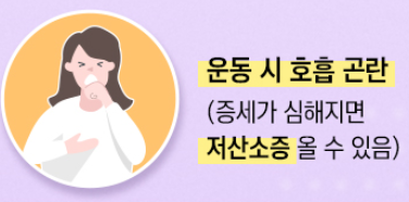 호흡 곤란이나 숨이 막히는 증상이 나타날 수 있습니다. 처음에는 심한 신체활동 후에만 나타나지만, 질병이 진행됨에 따라 일상적인 활동이나 휴식 중에도 숨이 차는 느낌을 경험할 수 있습니다.