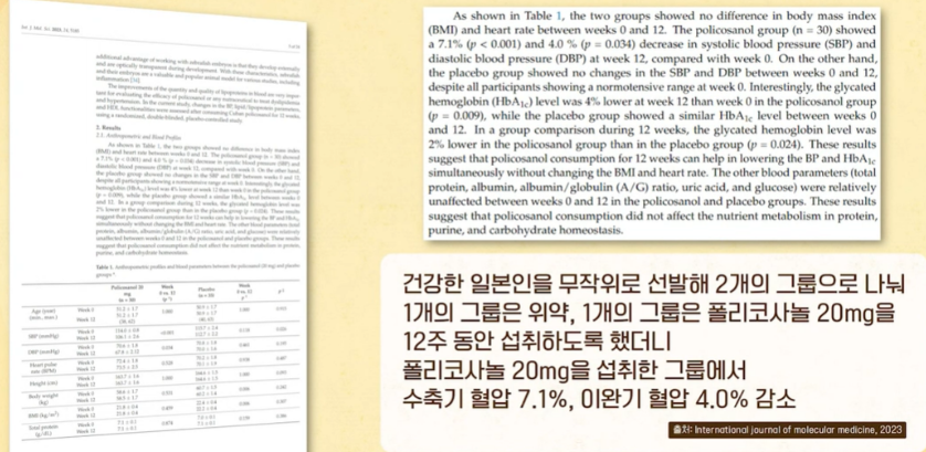 실제 한국인을 대상 연구 논문에 따르면 세 그룹에게 위약과 폴리코사놀 10mg 그리고 20mg을 각각 복용시켰더니 12주 후 위약 그룹은 수축기 혈압의 변화가 없었지만 폴리코사놀을 섭취한 그룹에선 수축기 혈압이 감소했다고 보고됐습니다.