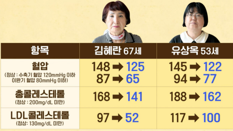 그리고 2주 뒤 그녀들의 기본적인 혈액 검사와 더불어 상태를 확인한 결과 김혜란 씨와 유상욱 씨 모두 콜레스테롤과 LDL, 콜레스테롤이 감소, 혈압 역시 낮아진 것을 확인할 수 있었습니다.
