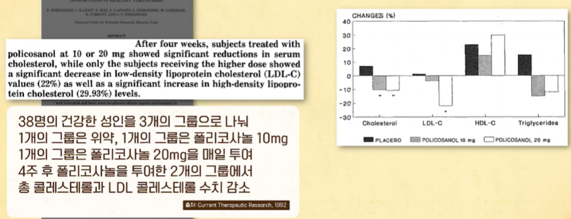 실제로 쿠바 국립과학연구소에서 연구를 했더니 폴리코사놀 사탕수수 왁스 알코올을 20mg을 4주 동안 섭취시킨 결과 총콜레스테롤이 낮아졌다고 보고한 바 있습니다.