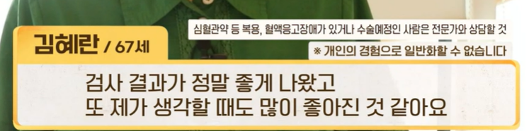 2주라는 짧은 시간 동안 식단도 좀 조절하고 폴리코사놀도 꼭꼭 챙겨 먹고 그랬더니 고혈압도 정상으로 떨어졌고 혈액 뭉친 것도 많이 좋아졌거든요. 그래서 굉장히 좋아요.
