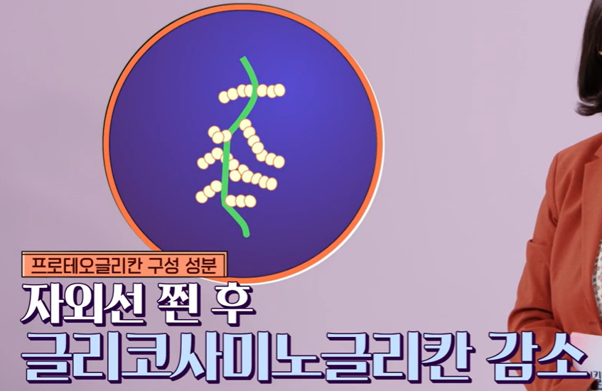 피부 진피층 세포 공장인 섬유아세포에 자외선을 직접 쬐면 프로테오글리칸 구성 성분인 글리코사미노글리칸이 많이 감소했다는 연구 결과가 있습니다.