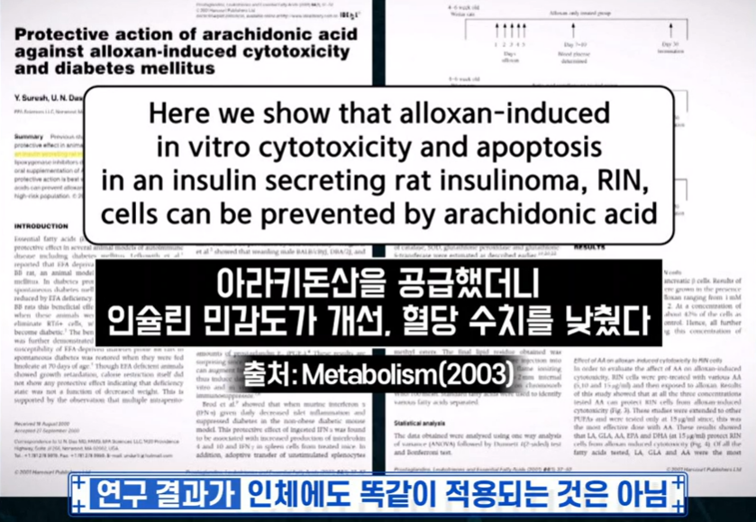 또한 당뇨로 고생하는 환자 2천여 명을 연구한 결과 혈중 아라키돈산 농도가 높을수록 당뇨 발병 위험이 46% 감소했다는 논문이 발표되었습니다.