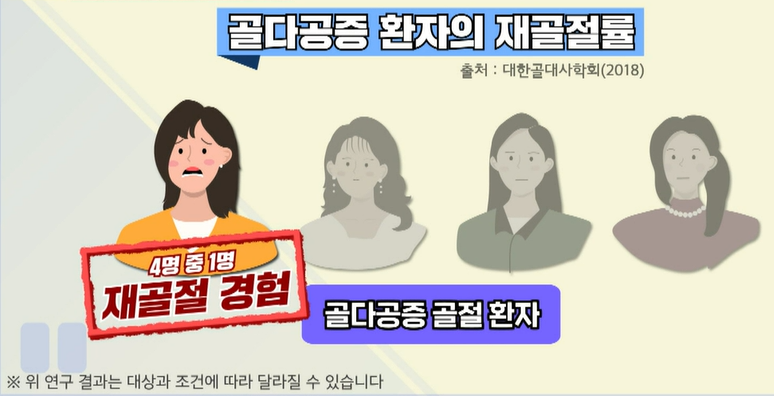뼈에 구멍이 많이 생기는 골다공증이 발생하면 뼈가 푸석해지고 약화됩니다. 때문에 기침, 재채기, 잠깐 삐끗, 허리 구부리는 극히 등의 일상적인 동작만으로 뼈가 부러질 수 있습니다. 골다공증성 골절은 한 번만 일어나는 것이 아니라 언제라도 재골절되기 쉽습니다. 실제로 골다공증 환자 4명 중 1명이 재골절을 경험했다고 합니다.